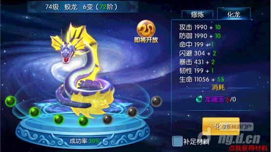 点击进入化龙按键,消耗相匹配总数龙魂玉,即还有机会提升化龙级别。