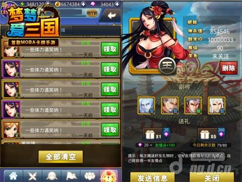 《梦梦爱三国》好友系统不但可以看一下好友信息内容、与好友闲聊,更有着不同的“友情点”系统,变成好友以后,能通过向好友送精力或送礼的形式得到友情点。