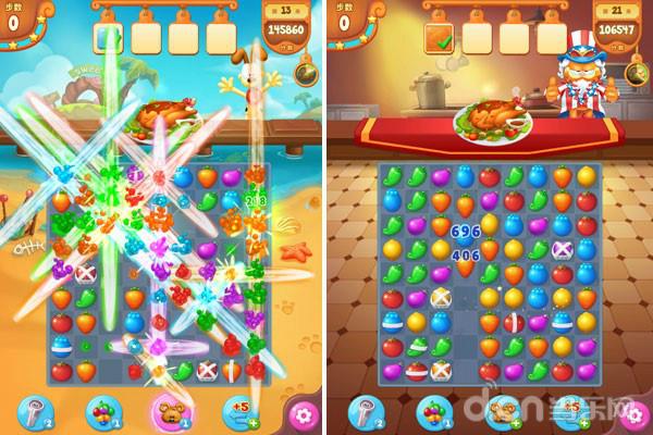 高端食材被消除的时候会引起动画特效,例如消除整排、整行、斜十字等。