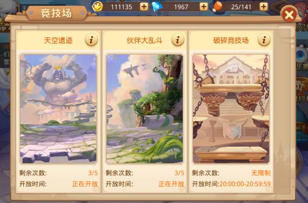 主要包括了让玩家可以随时随地与别人对决的天空遗址、由玩家小伙伴全过程出战的小伙伴乱斗,及其真人版及时同歩PVP玩法破碎竞技场,不同类型的竞技场针对不同玩家的大战要求,使你随心所欲挑选自己喜欢的PVP方式。