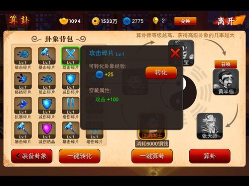 卦象之一就会有进攻卦象,卦象自身能通过卦象工作经验开展更新,每一次提升均可提升卦象的属性。