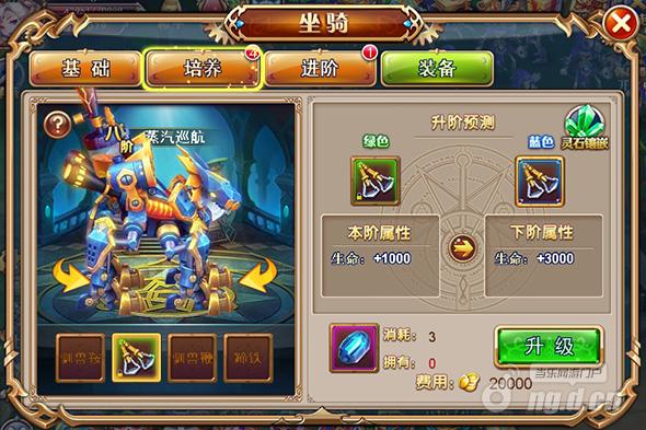 坐骑升阶网页页面中可以浏览下一阶坐骑品牌形象,坐骑等阶越大,不仅可以得到更绮丽外观,也会有指数式增长的大战属性,可以为人物角色带来很大的战斗能力提升。