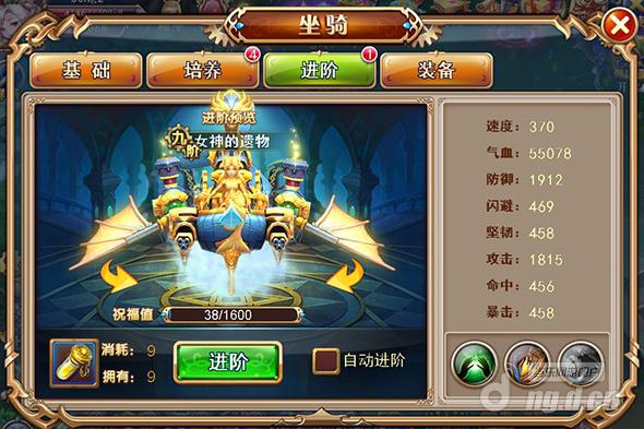 此外坐骑提升到一定阶层,会获得坐骑专业技能:1、 生命之证:3阶坐骑得到,三个职业技能各自提升血气包回应量15%、25%、50%;2、 守护之力:6阶坐骑得到,受到攻击时会概率免疫力一切专业技能,三个职业技能各自不断4、6秒;3、 机械设备形状:9阶坐骑得到,可激话古时候机械能量,暴伤由1.5倍提升至2倍。