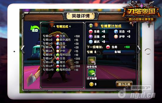 《刀塔帝国》英雄除开能通过升阶加强,也可以通过突破和专精来提升。