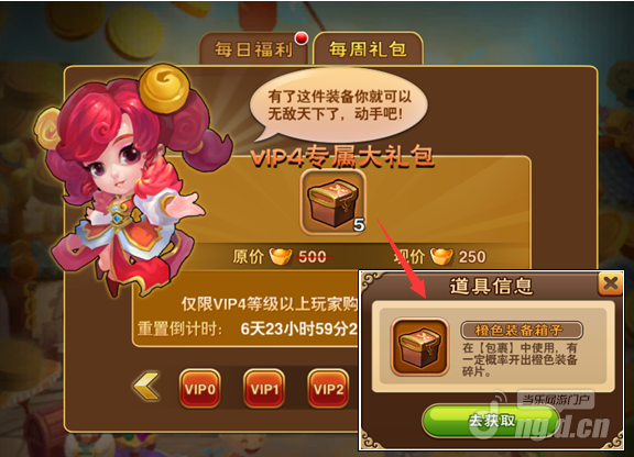 Vip奖赏豪礼或在线充值豪礼里可包括装备或装备碎片