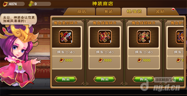 可以用威望值在神装店铺选购蓝装、紫装和史诗装备的装备碎片;60级后提升金装碎片。