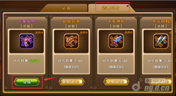 搜集同名的装备的碎片,耗费一定数量的碎片可生成一个制成品装备(在“装备碎片”页面生成)