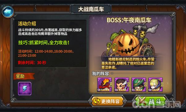 按时赚精力 深夜南瓜车搞笑幽默趣逗 游戏里面还设定有定时打南瓜车游戏的玩法,在每日的12:00-14:00,18:00-20:00,21:00-23:00,深夜南瓜车BOSS都会发生在游戏主界面的右边。