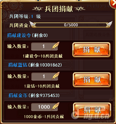 4.兵团原始级别为1,原始成员限制为30,兵团成员能通过捐赠金币、蓝钻、兵团基本建设令来提高兵团资金,兵团资金越大,能够升级成高级别的兵团,兵团成员的褔利就会越多。