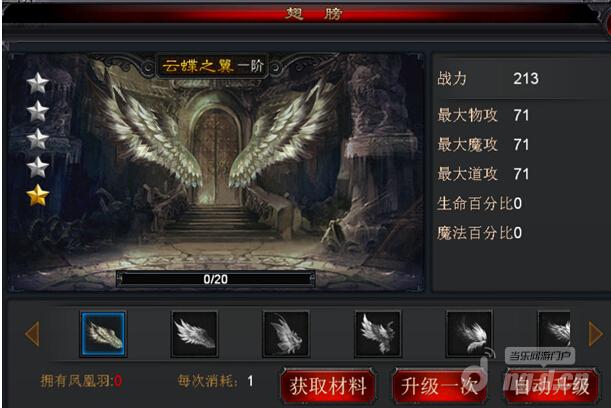 页面显示的是翅膀形象、现阶段所拥有的凤凰羽总数,及其升阶一次需要凤凰羽的总数。