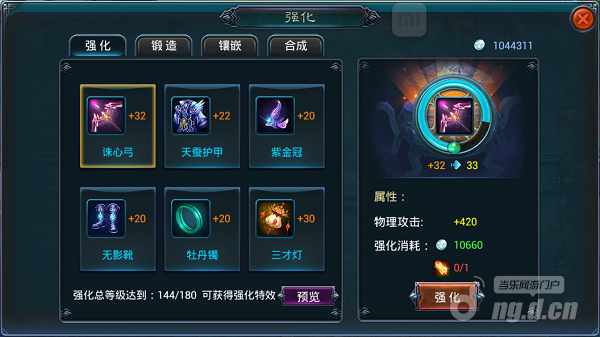 根据强化提高装备特性,而且伴随着总体强化档次的提升,有着不同的发光效果。