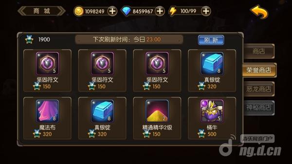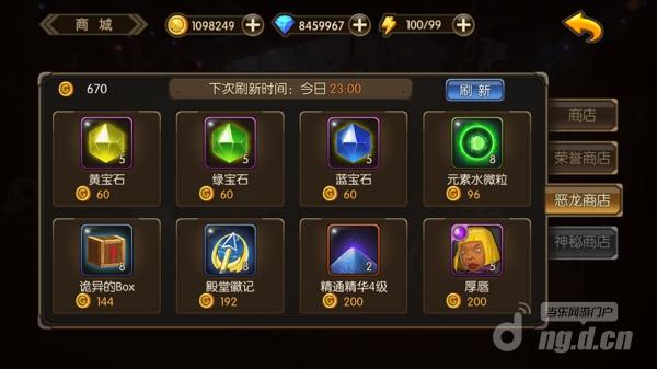 恶龙商店:恶龙来临打开后,玩家根据考验恶龙副本得到恶龙币,可用作恶龙商店交易,前三格售卖天资升阶使用的晶石,然后就是稀有物品,工作经验秘药,稀缺灵魂石。
