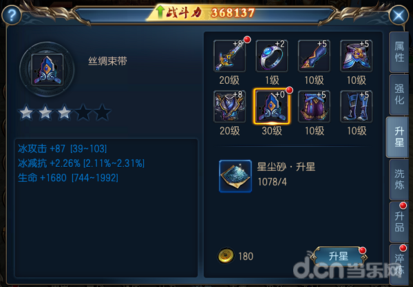 在级别50级以前可以多升阶,高级别的星数针对属性提高有质的变化,蓝5星能够洗出来662的元素进攻,而绿5之仅有最大400多,提高了接近50%。