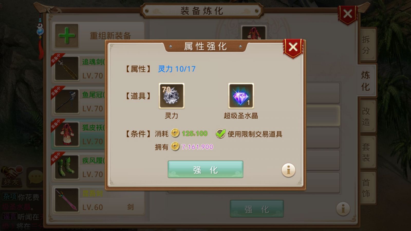 炼化套服 金色装备 超级绿紫水晶,能够炼化墨绿色的套服,炼化可以选择五行相性,通过率100%。