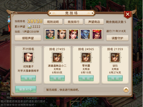 3、竞技场战争中,作战超出50来回,即第51来回时,分辨彼此主人公修为,修为强的看作击败,修为低看作兵败。