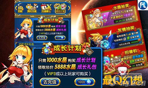 所以只要达到上面这些细微的标准,你就能够把各种水晶、游戏道具捧回家了咯,这般值得的一笔账,你总也不会轻易放了吧!在《最Q幻想》游戏里面,只需买了成长计划的玩家在25—60级间,每过5级都可以领可观的成长礼包,简直是红果果诱惑,看起来狂甩别人许多条街将不会只是梦。