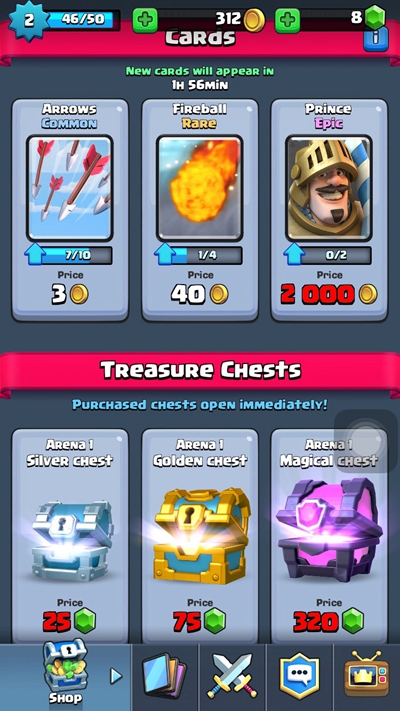 关键在于店铺,店铺用于给予玩家所需的卡牌,能用金币选购卡片,在其中卡片主要包括普卡、稀有卡和传说卡三种类型,初次选购的金币耗费分别是3、40和2000金币,可是重复购买同一种卡耗费将提升,24小时之后更新到原始价钱。