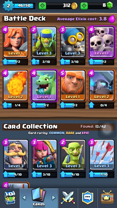 在配兵上,初学者们尽量按自己习惯性打法卡片级别进行搭配,在刚开始多更新自身爱用的卡牌,或是用级别强的卡牌。
