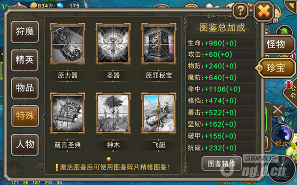 图鉴主要有两种游戏玩法,一种是地图中放置挂机杀怪,总计到一定数量激话该怪物图鉴,得到属性;另一种是参加各种各样得到,得到图鉴残片,集满图鉴八个不一样位置的残片就可以激话图鉴得到属性。
