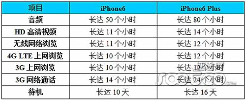 据了解,iPhone6 的在线时间从 iPhone5S 的40钟头提升到50小时,而 iPhone6 Plu 也是提升到80钟头,官方数据表明 iPhone6 Plus 续航时间约是 iPhone6 的1.5倍,主要表现仍然需要之后的具体判断和长期使用。