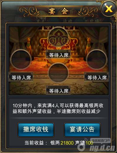 国宴-摆宴款天底下客人如果你觉得银两与威望来的很慢,可以尝试一下摆放国宴。