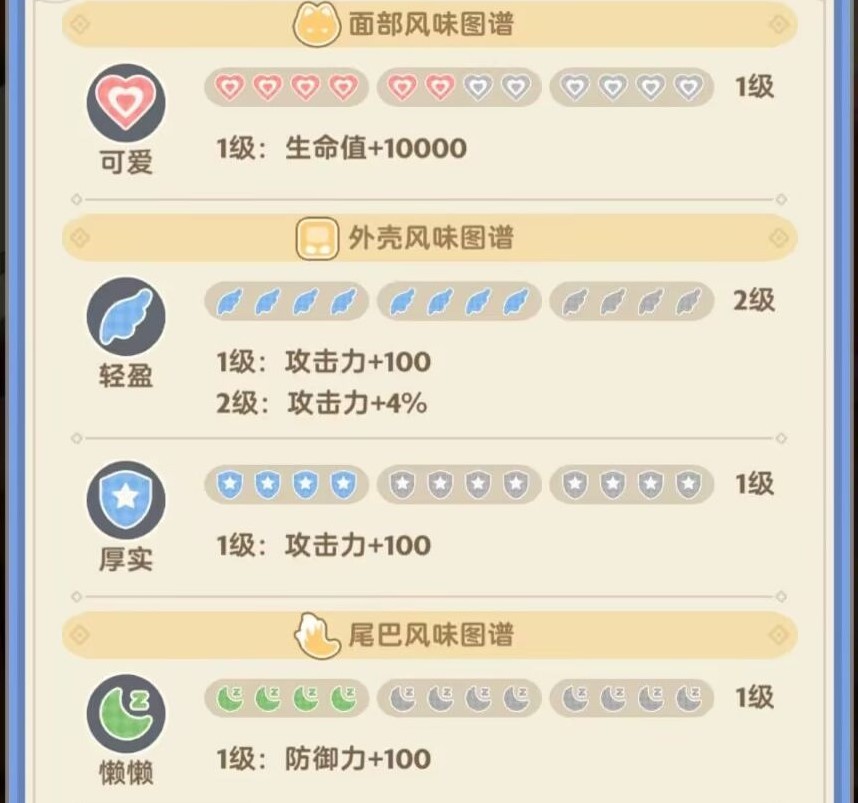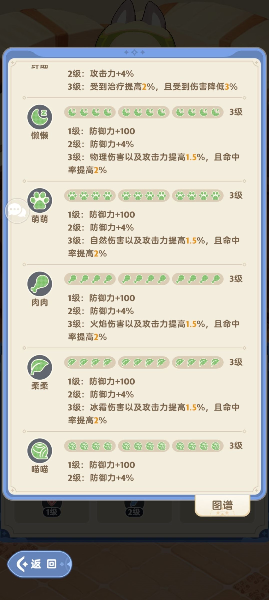 每个猫猫包分别都有红、蓝、绿三种羁绊词条(风味特征),每个颜色有7种词缀,同色羁绊中同词缀凑够4、8、12可以分别开启一段羁绊加成。