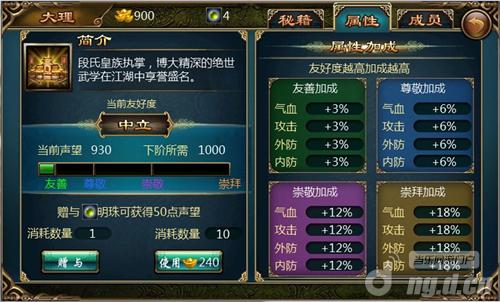 游戏里面有11个门派,能通过赠予物件或参加掌门人之战的方式去提高不一样门派的声望值,每达到一个威望环节,能够学好1个归属于该门派的秘籍,不一样镖师相匹配不同类型的门派,当该门派的镖师上场时,其作战特性也会提高。