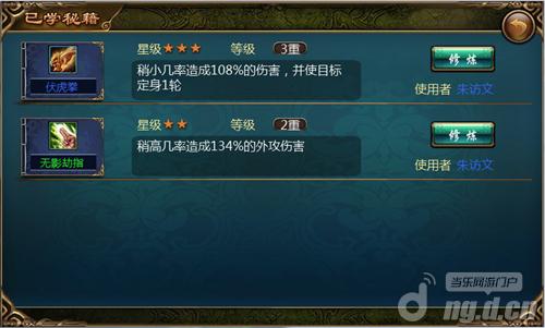 根据提高不一样门派的威望来学好不同类型的“秘籍”,每一种秘籍仅有1本,秘籍能够武器装备在镖师的秘籍格上,战争中有概率释放该秘籍,能够对秘籍开展修练来提高重数,秘籍重数提高后杀伤力及释放几率都是会提升。