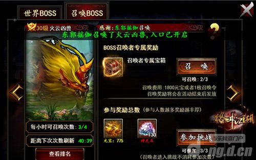 新资料篇中的《格斗江湖》只要是有玩家招唤BOSS以后,别的玩家都能免费参与挑战,一同击败BOSS赚取可观的奖励和元宝喔。
