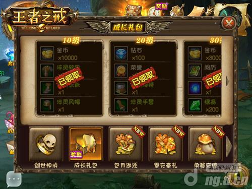 在《王者之戒》的成长礼包内有数不清的好东东,例如经验、裸钻、武器装备、原材料、宝石及其附加送的VIP这些,自然自然少不了白花花的金币啦!