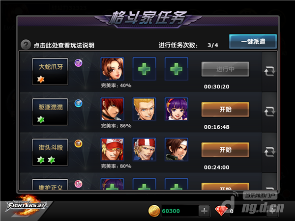 2、每天只能进行4次每日任务,把属性好一点的格斗家优先选择一起完成一个每日任务,再接着进行下一个新人物,不必一下子4个每日任务一起进行,属性不太好的格斗家会导致极致率太低,危害任务结束时间与奖励;