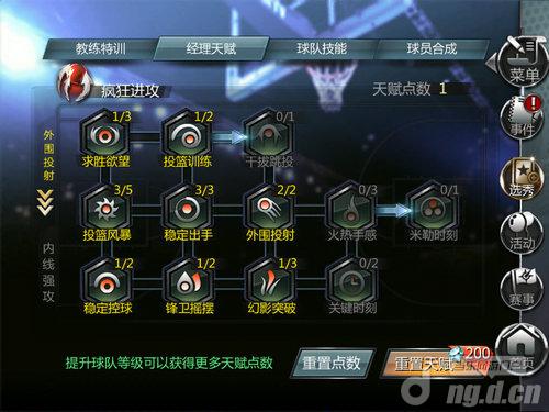 教练员训练:运用“教练员训练”永久提高不一样区域的属性,进攻型精英团队可尽可能集中化练习SG、SF两个部位,其次PF,PG、C保持球队均衡就可以。