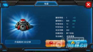 伴随着提高级别耐用度及对地电压、对空攻击力都将提高(点一下地堡可以看一下到属性及提高后属性),必须耗费的时间以及金子总数都是在里边能直接查询到。