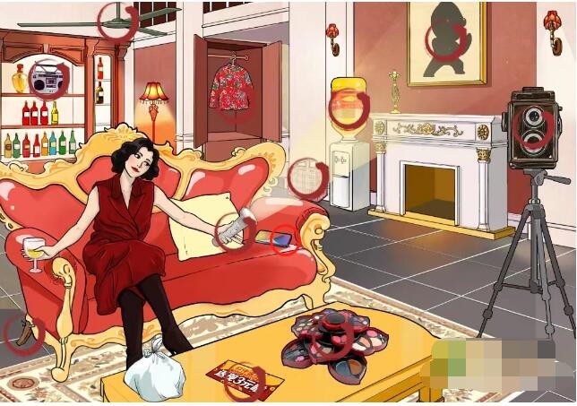 沙发断腿、好评返现、饮油机、手电筒、直男彩妆盘、薅羊毛群(点击手机)、老式照相机、光之化身(长按手电筒)、塑料编织袋、大花袄(点击打开衣柜门)、老收音机、吊扇