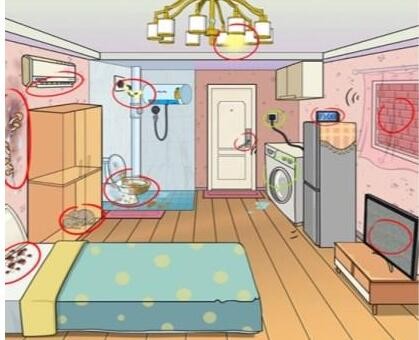 2、然后其他的用放大镜可以发现空调坏了、马桶、墙壁、床头、柜子、插头、门锁、电视、冰箱上的东西都有问题。