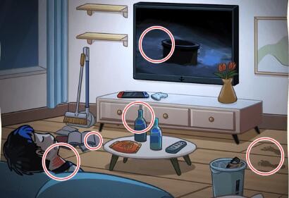 1、客厅:电视枯井、脚印、多余的瓶子、掉落的书、脖子上的掐痕。