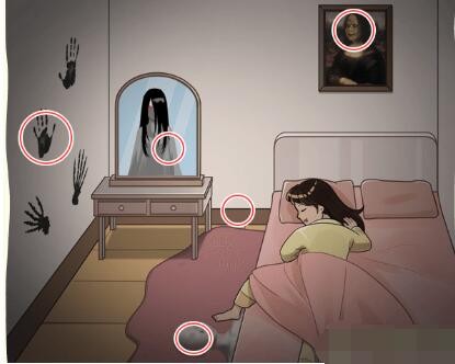 2、卧室:墙上的手印、镜子里的影子、消失的台灯、床底下的影子、诡异的画。