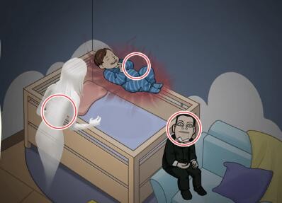 3、婴儿房:床前的鬼影、漂浮在空中的宝宝、诡异娃娃。