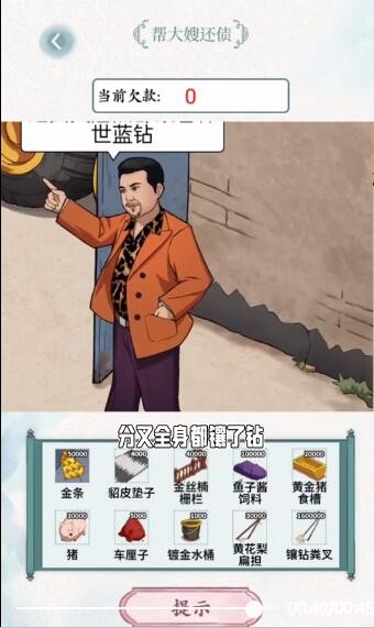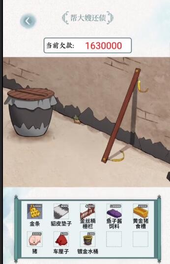 1、文字脑洞禽兽不如帮大嫂还债答案:金条、貂皮垫子、金丝楠栅栏、鱼子酱饲料、黄金猪食槽、猪、车厘子、镶金水桶、黄花梨扁担、镶钻粪叉