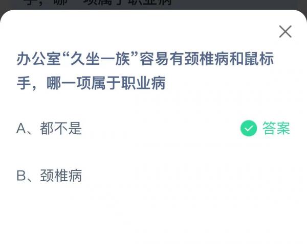 以上就是本站小编给大家带来的:办公室“久坐一族”容易有颈椎病和鼠标手,哪一项属于职业病?支付宝答题4月25日答案2023蚂蚁庄园。想要了解最新问题答案的 小伙伴一定不要错过哦!