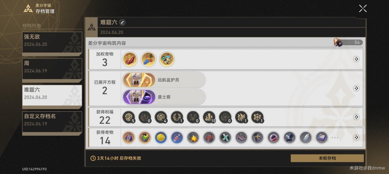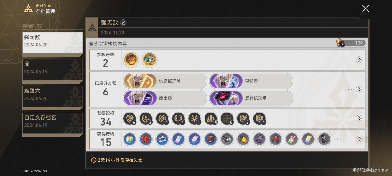 开局时,如果有废土客,就选废土客(前期核心方程)。没有的话,随便选。然后选择首选毁灭祝福,如果没有就存护祝福和虚无祝福(后面会用到)。如果都没有,就选能减伤和回复的星级高的奇物。选房间时,优先选择冒险、奖励、投资、事件、商店、战斗和遭遇的顺序。第一间守关boss房间,如果有废土客,直接换毁灭祝福展开即可。没有的话,就换方程(一两次就行,留点碎片)。如果有,那就好打。如果没有,也能打。打过之后,三级方程首选远航监护员(核心方程)。如果没有,随便选(之后在猫猫糕那里换,所以之前不建议换多次)。加权奇物首选加击破伤害和火焰击破的,其次是治疗量转护盾的和虚数击破推条的。这四个里面经量有一个就可以往后面玩。如果没有,建议重开。后面房间也是一样的思路。最后说一下,毁灭祝福尽量不要丢,存护祝福找减伤的,虚无祝福随便凑三个就行(有加击破的更好),最好有一个治疗会扩散的三星丰饶祝福。补充一些增加体验感的奇物,一个是加一级星魂的,一个是桂冠,桂冠可以防止第二个收关boss翻车。以上就是分享的心得,希望对大家有所帮助。
