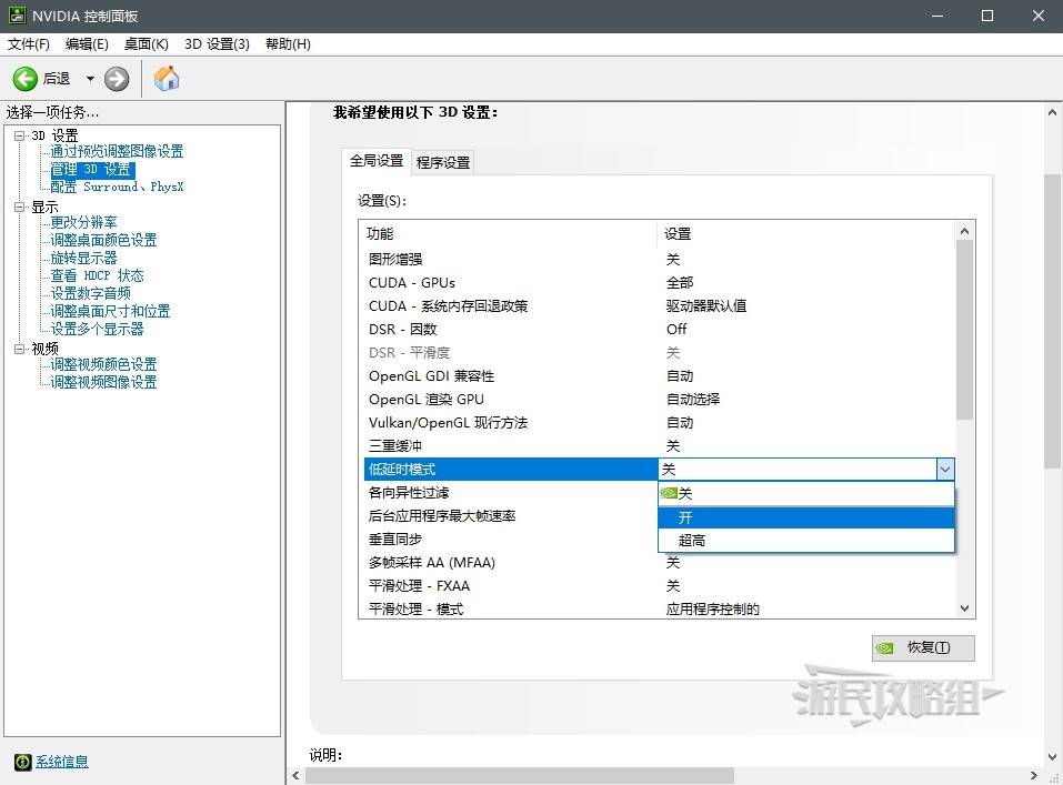 在全局设置中找到【低延时模式】,打开它(如果在游戏中已经开启了NVIDIA反射低延迟,则可以跳过这一步)。