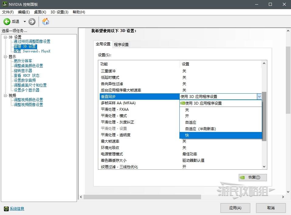 然后找到【垂直同步】,将其调整为【快】。