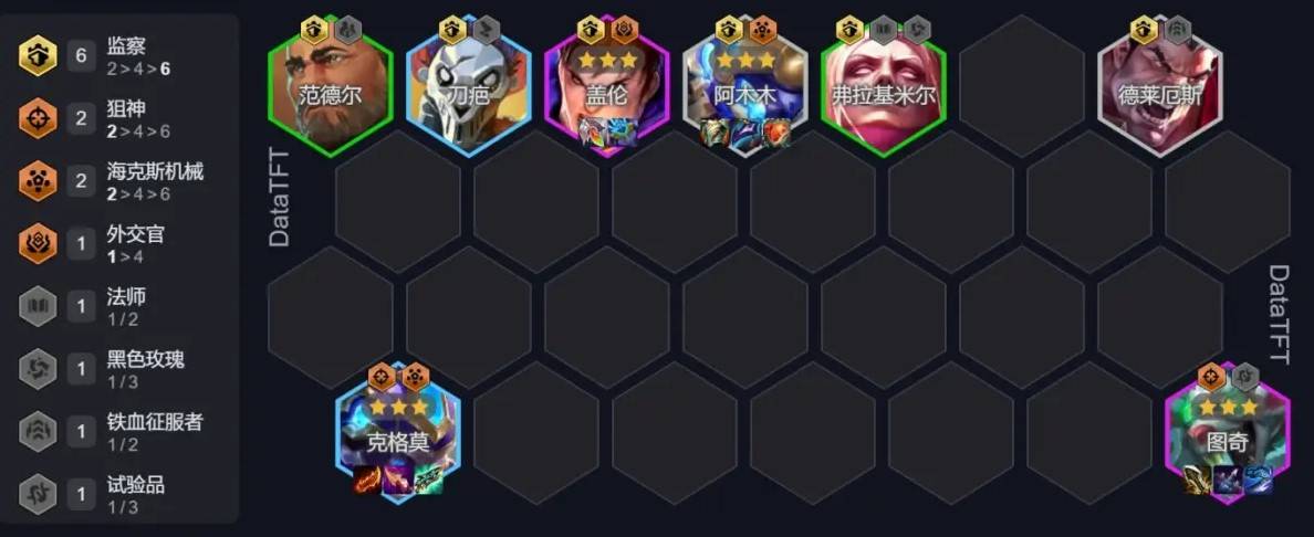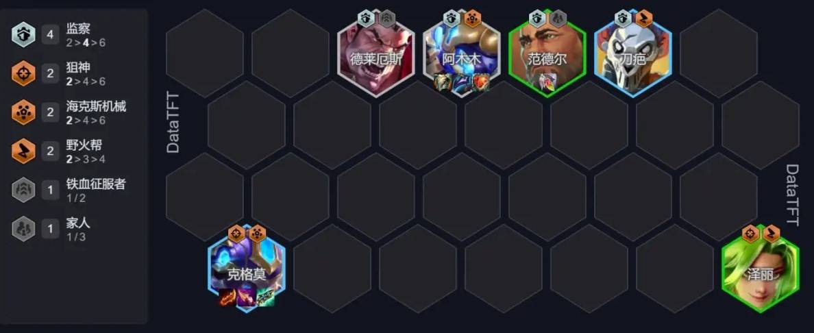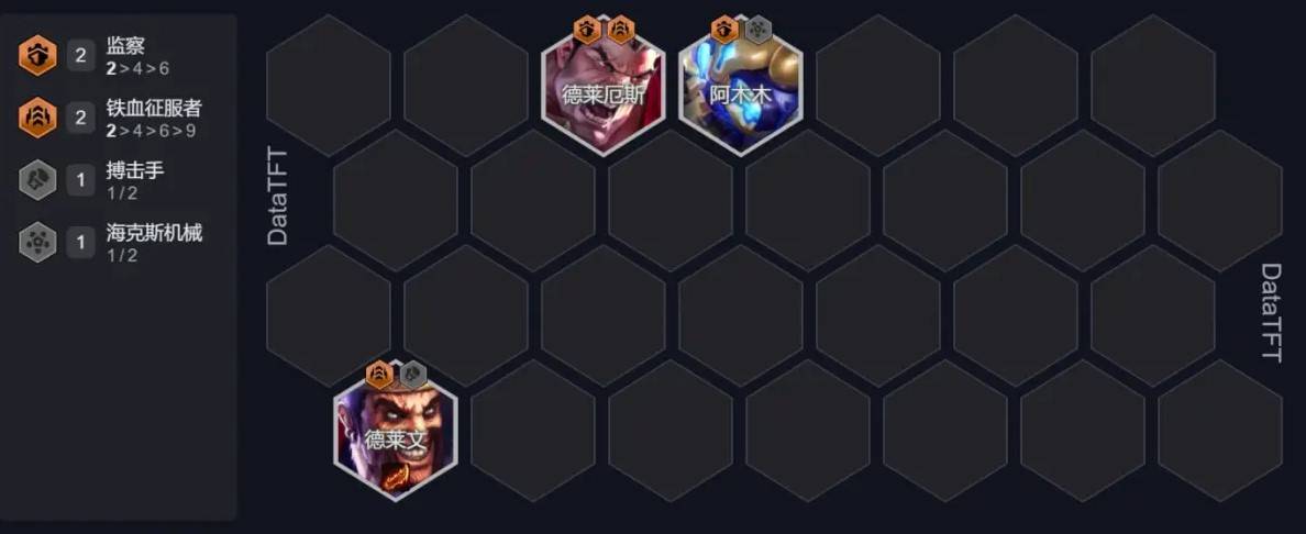 阵容前期可以上德莱文和诺手凑2征服者加阿木木凑2监察,前期2星德莱文一把羊刀,稳住前期没啥问题。