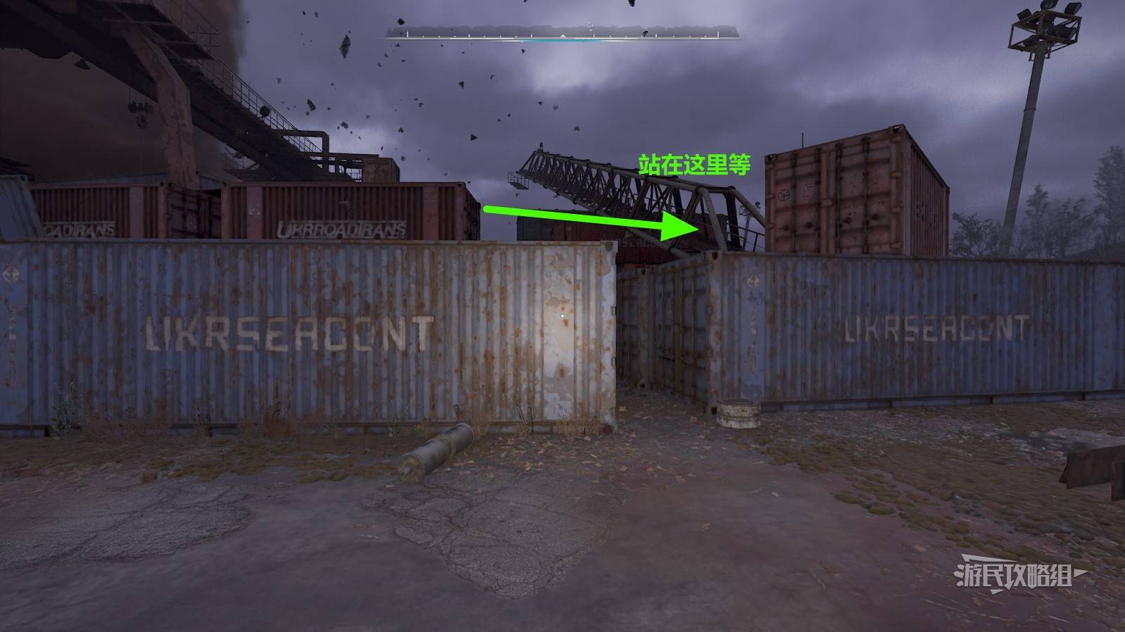 大致路线和方向如下图所示。因为需要在龙卷风眼中行走一段时间神器才会刷新,所以尽量在龙卷风中沿着从低到高的集装箱一路走到吊车顶部等待。