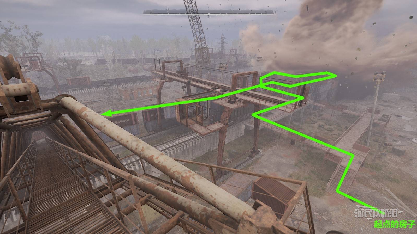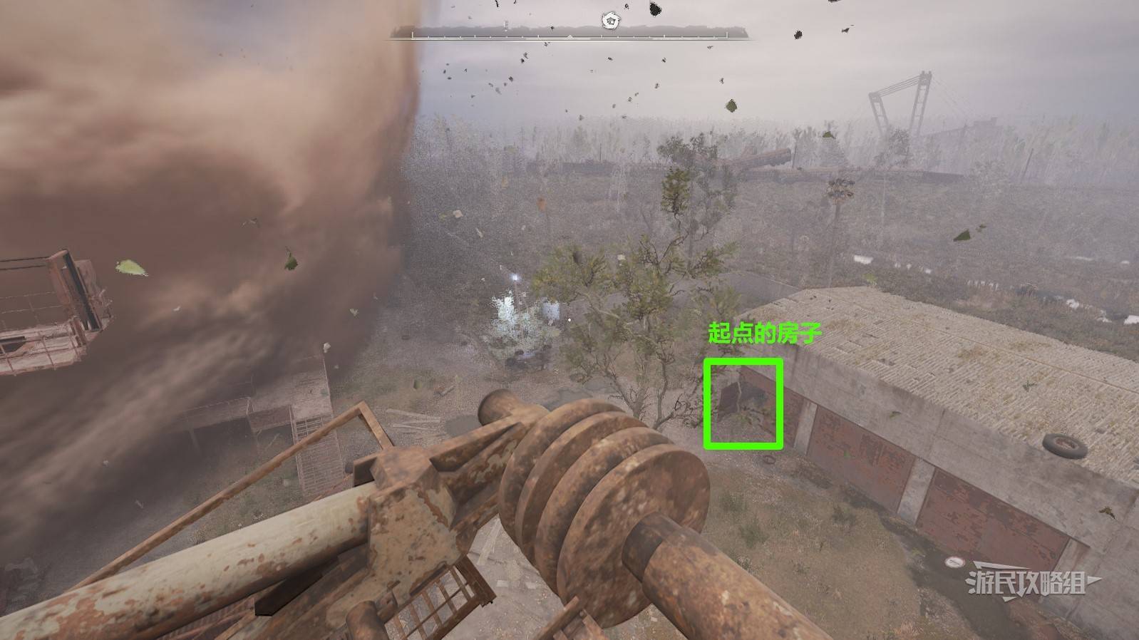 进入龙卷风内部后,要跟随龙卷风的移动路线往前走,最终的目标是到达房子对面的吊车顶部(参考下图,截图位置为最终位置)。