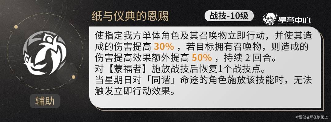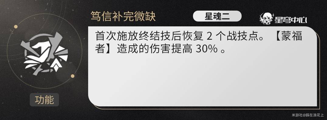 大招给予目标30%伤害加成,首次释放后恢复两个战技点,与专属使星期日产点能力堪比4魂花火。