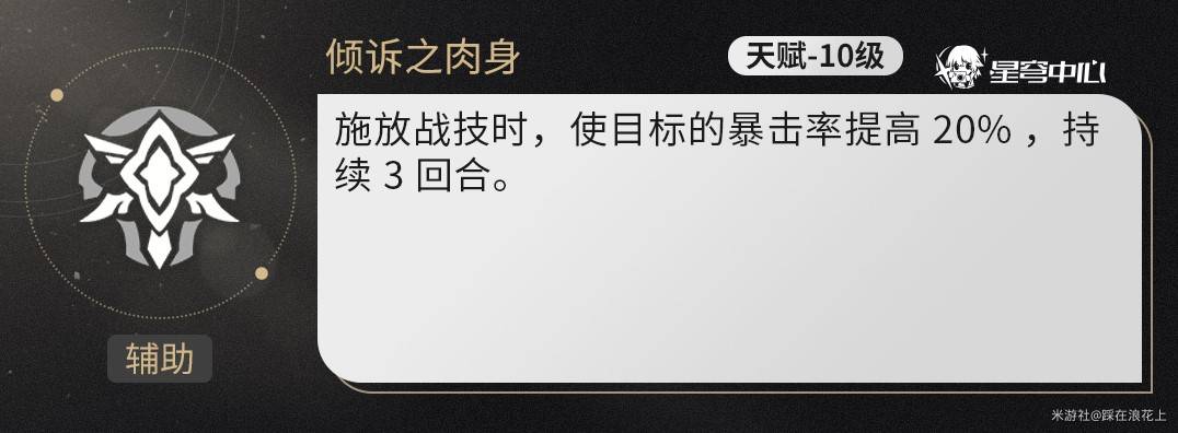 提高战技目标20%的暴击率,持续3回合,几乎全程覆盖。