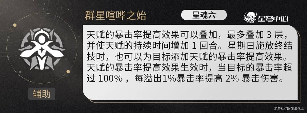 星期日技能形成联动后,提升主C暴率和暴伤,兼顾拉条和充能,搭配专属光锥产出战技点。