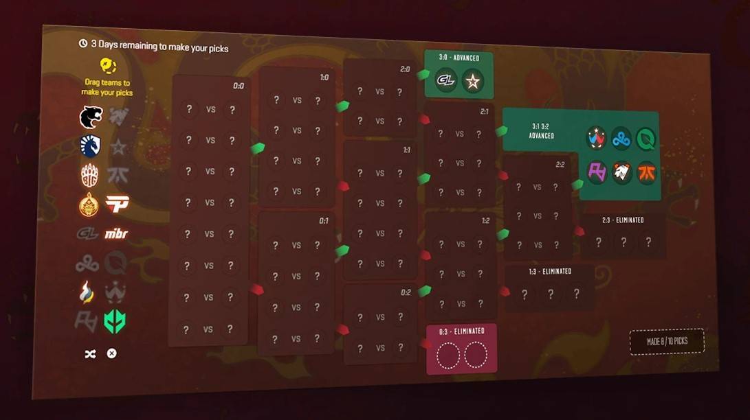目前只有上海Major 2024的开幕阶段竞猜开放。为获得钻石币,需至少5/10个选择正确。